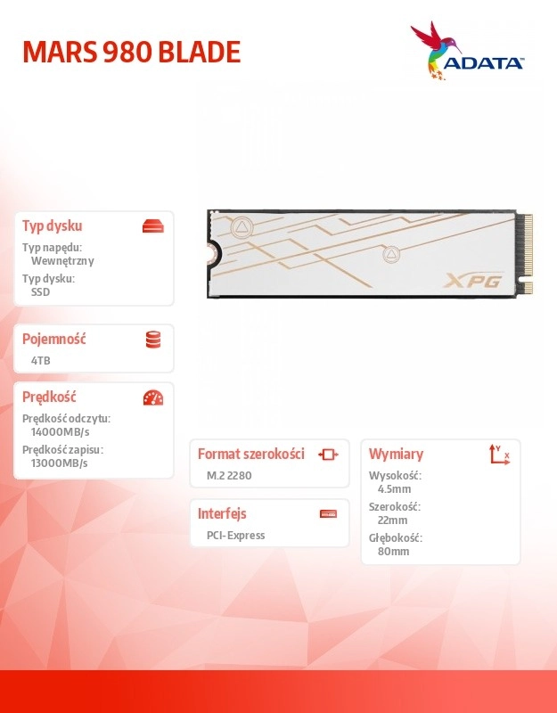 SSD-schijf XPG Mars Blade is de eerste PCIe 5.0 SSD die is ontworpen voor laptops. Met bliksemsnelle lees-/schrijfsnelheden tot 14.000/13.000 MB/s en een capaciteit tot 4TB levert hij stabiele prestaties voor de meest veeleisende taken.