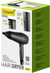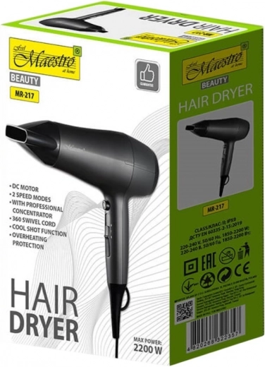 De Maestro-haardroger is uitgerust met een DC-motor, die een lange levensduur en stille werking garandeert. In de verpakking vindt u een concentrator, die een nauwkeurige geleiding van de luchtstroom mogelijk maakt, ideaal voor het creëren van diverse kapsels.