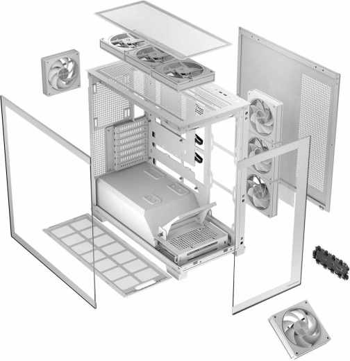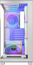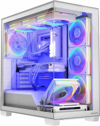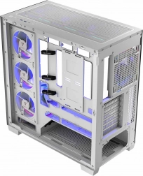 De behuizing is compatibel met zowel standaard als omgekeerde moederborden en ondersteunt waterkoeling tot 360 mm. Het ruime interieur biedt voldoende ruimte voor de grootste componenten, zoals grafische kaarten tot 420 mm en CPU-koelers tot 175 mm.
