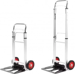 De transportwagen is uitgerust met een telescopische duwbeugel, een opklapbaar platform en een automatisch vergrendelsysteem, wat zorgt voor snelle inzetbaarheid en compact opbergen. Het geheel wordt aangevuld met slijtvaste rubberen wielen op stalen assen, gelagerd, die het oppervlak niet beschadigen en zorgen voor een soepele loop.