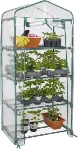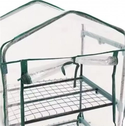 De kas is uitgerust met vier planken: twee in volle breedte en twee halve, waardoor je de ruimte vrij kunt indelen afhankelijk van de hoogte van de planten. Praktische ritsdeuren bieden snelle en gemakkelijke toegang tot het interieur.