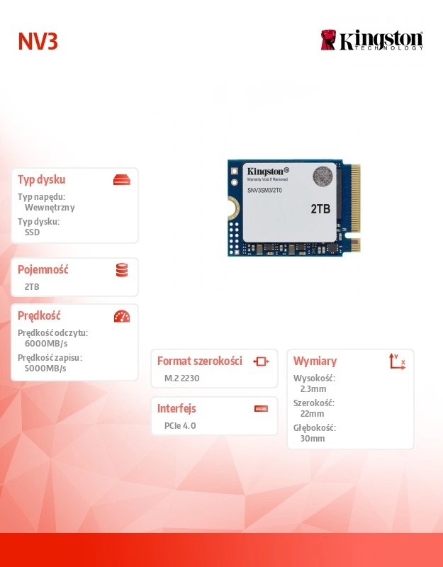De Kingston NV3 biedt moderne opslag voor dagelijks werk en gamen. Dankzij de PCIe 4.0 NVMe-interface en het compacte M.2 2230-formaat levert hij hoge snelheid, efficiëntie en eenvoudige integratie in apparaten met beperkte ruimte. De 2 TB capaciteit biedt voldoende plaats voor apps, documenten, foto’s, video’s en games.