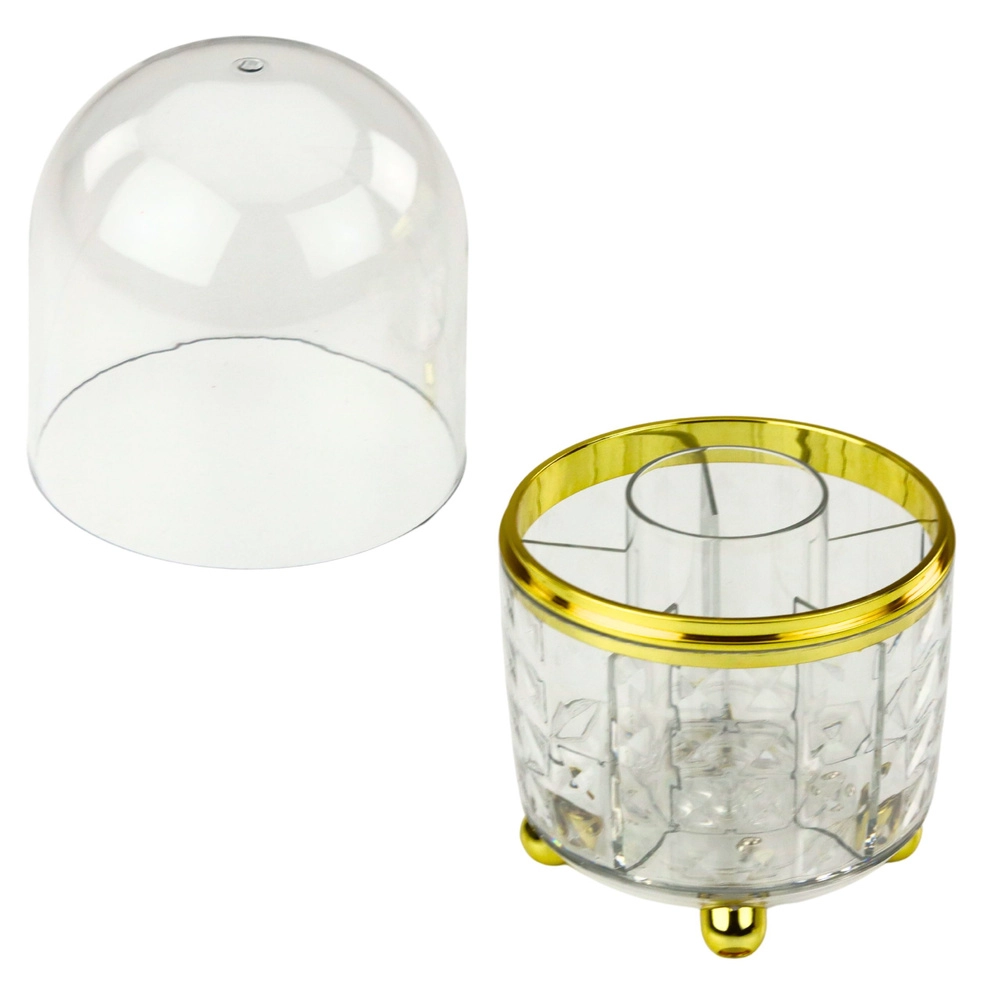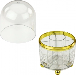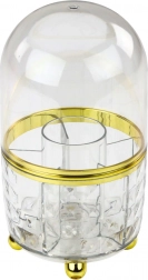 De organizer is gemaakt van duurzaam plastic in glas-look en afgewerkt met een elegante gouden kleur. Binnenin bevinden zich praktische compartimenten voor het ordenen van kwasten, lippenstiften, mascara’s of kleine accessoires.