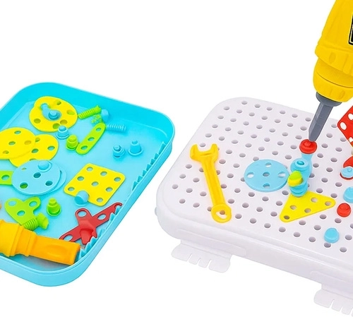 De creatieve mozaïek verveelt nooit dankzij de mogelijkheid om 3D-constructies te bouwen met wel 196 verschillende onderdelen, die de creativiteit van kinderen bij elke nieuwe compositie stimuleren. De veilige kinderboormachine draait slechts in één richting, met een aangepaste snelheid, wat de veiligheid tijdens het spelen waarborgt.
