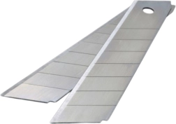 Segmentmessen met een breedte van 18 mm en een lengte van 9,5 cm zijn ontworpen voor precies snijden van papier, karton, folie, gips of dun plaatmetaal. Elke set bevat 10 mesjes die zijn opgeborgen in een praktisch kunststof etui.