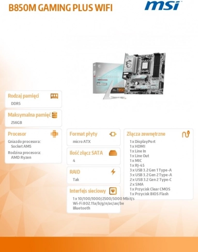 Moederbord B850M Gaming Plus Wifi AM5 is ontworpen voor gamers die op zoek zijn naar een complete ervaring met uitgebreide connectiviteit en geavanceerde Wi‑Fi‑oplossingen, inclusief de nieuwste Wi‑Fi 7‑technologie, 5G LAN en PCIe 5.0.