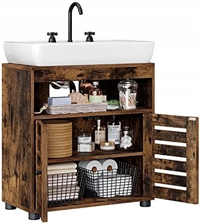 Creëer een esthetische en functionele badkamer met deze rustieke wastafelkast. Het compacte maar ruime ontwerp helpt bij het organiseren van handdoeken, cosmetica en hygiëneproducten, terwijl het een elegante uitstraling behoudt. Gemaakt van duurzaam spaanplaat in een trendy rustiekbruine afwerking, brengt het warmte en karakter in elke ruimte.