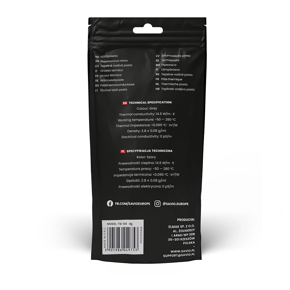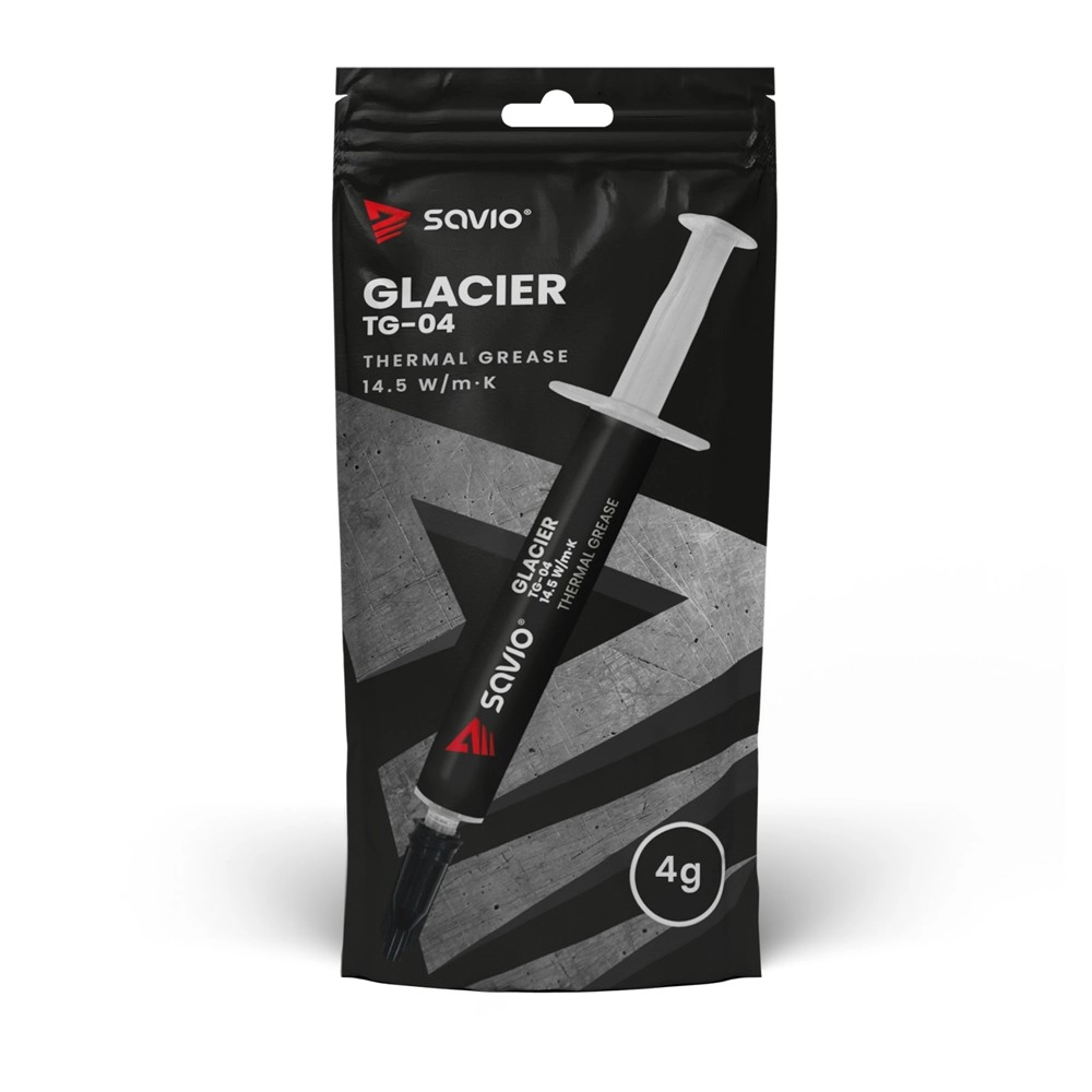 Thermische geleidende pasta Savio Glacier TG-04 is de ideale keuze om optimale warmteafvoer tussen processor en koellichaam te garanderen. Deze pasta met uitstekende thermische geleidbaarheid van 14,5 W/mK vult microscopische ruimtelijke oneffenheden op, wat de koelingsefficiëntie verhoogt.