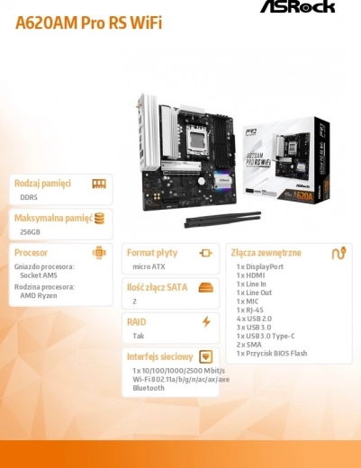 Het hoogwaardige moederbord A620AM Pro RS WiFi is de ideale keuze voor computerenthousiastelingen die op zoek zijn naar betrouwbaarheid en prestatie. Met ondersteuning voor de nieuwste AMD Ryzen-processors en meerdere interfaceopties is dit bord klaar om compromisloze prestaties te bieden.