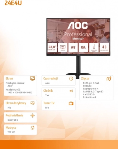 Deze monitor gebruikt Adaptive Sync voor synchronisatie met de grafische kaart en minimalisatie van ongewenste beeldartefacten. Hij is uitgerust met ingebouwde luidsprekers van 2 x 2 W en een brede reeks poorten, waaronder HDMI 1.4, DisplayPort 1.2, VGA en vier USB 3.2 Gen 1-poorten.