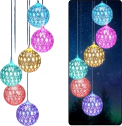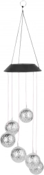 Deze lamp bestaat uit zes geperforeerde bollen die aan dunne koorden hangen, die zacht gloeien en het licht van de ingebouwde RGB-LED’s weerkaatsen. Dankzij de zonnestroom zijn er geen kabels of batterijen nodig – een ecologische en handige oplossing. De ingebouwde schemersensor schakelt het licht automatisch in zodra het donker wordt.