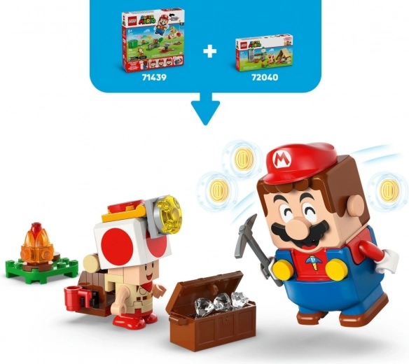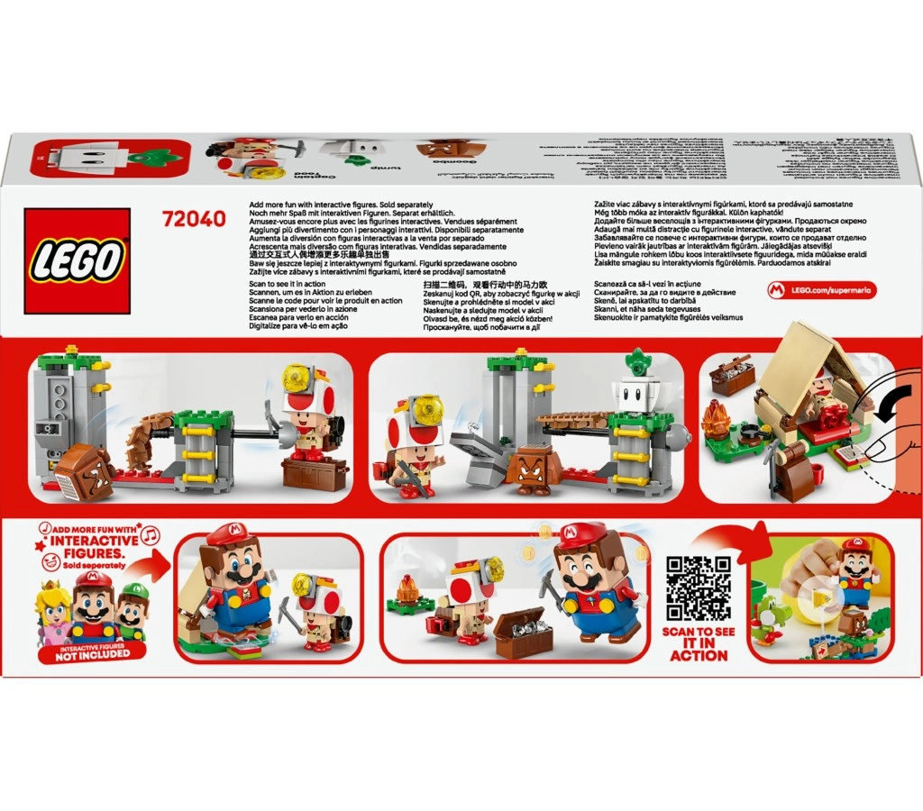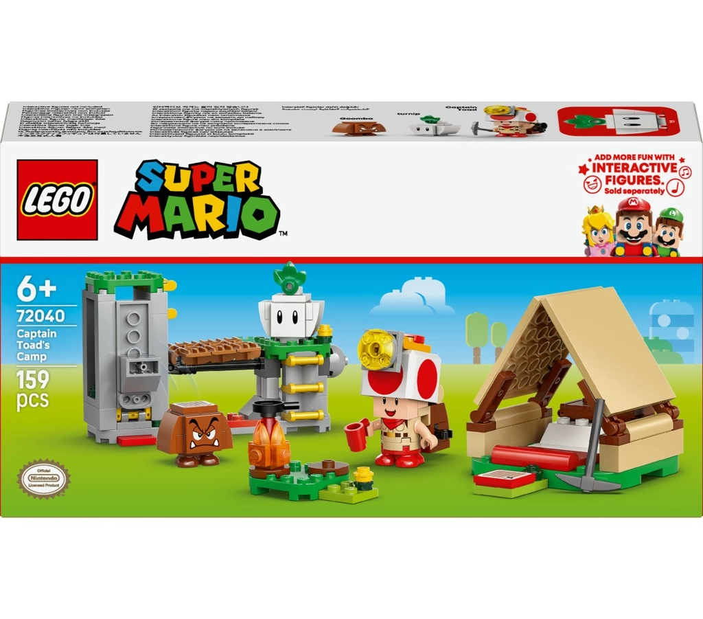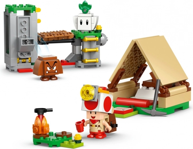 Creëer een avontuurlijke scène met het kamp van Kapitein Toad: bouw een tent met schatkist, maak een kampvuurtje, verken het rotsplateau en activeer de valbrug die een tegenstander in de “lava” laat vallen. Zoek en verstop diamanten, versla de Goomba en ontspan bij het vuur – kortom: een perfecte dosis creatief speelplezier.