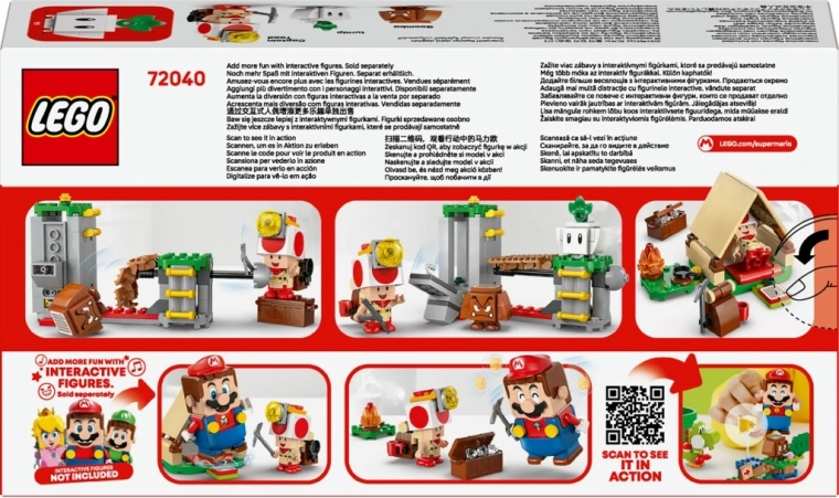 Voor nog meer fun voeg je een interactieve LEGO Mario, LEGO Luigi of LEGO Peach toe en spring je op actietags in de tent en bij vijanden om digitale reacties te activeren en beloningen te verzamelen. In de doos en in de LEGO Super Mario app vind je duidelijke handleidingen en inspiratie om te bouwen en levels aan te passen.