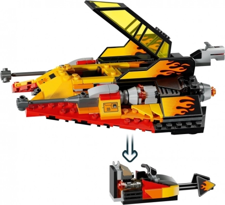 De openslaande dubbele cockpit verbergt een afneembare speeder – druk op de stoel of het hoofd van het minifiguur en de speeder schiet direct de actie in.