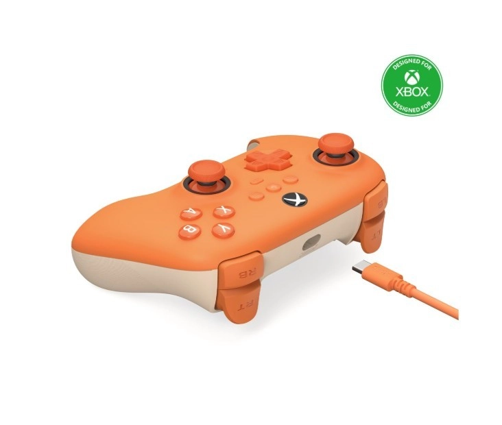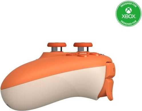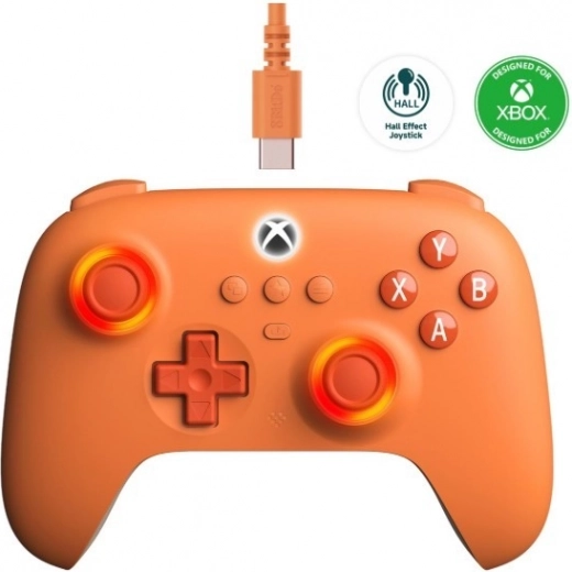 Het ergonomische design in een elegante oranje kleur biedt niet alleen een moderne uitstraling, maar ook comfort en stabiliteit tijdens lange speelsessies dankzij de geprofileerde grepen.
