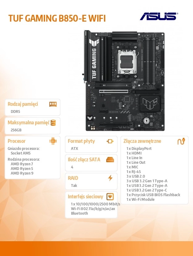 De ASUS TUF GAMING B850‑E WIFI is een solide basis voor een krachtige gaming-pc. Het bord is ontworpen met TUF‑klasse componenten en ondergaat strenge tests om te presteren waar anderen tekortschieten. Geoptimaliseerde stroomvoorziening en geavanceerde koeling behouden stabiliteit en lage temperaturen onder belasting.