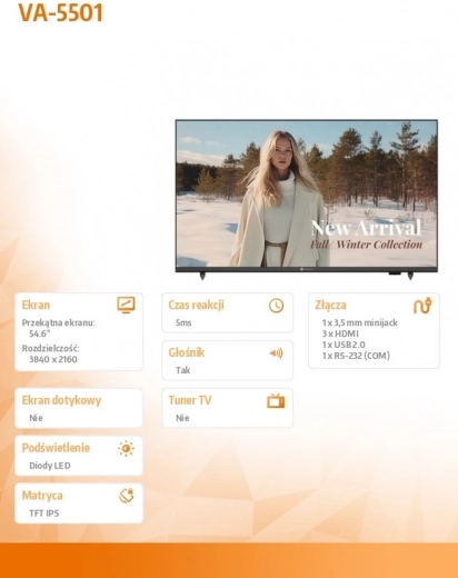 Geniet van een gedetailleerd beeld in 4K UHD-kwaliteit op een slank, elegant display dat perfect past in moderne interieurs. Stabiele pootjes en het slanke profiel zorgen voor eenvoudige plaatsing op tafel of in een standaard, terwijl de achterzijde praktische connectiviteit biedt voor zakelijk en retailgebruik.