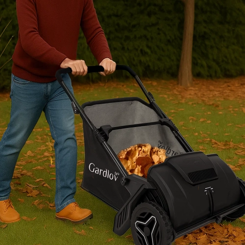 De praktische handveger GARDLOV met aandrijving zonder motor verzamelt blad, gras en klein vuil stil en milieuvriendelijk. Dankzij de verstelbare borstelhoogte van 0–40 mm past hij zich aan verschillende ondergronden aan, terwijl de ruime opvangzak van 100 l minder vaak legen en efficiënter werken betekent.
