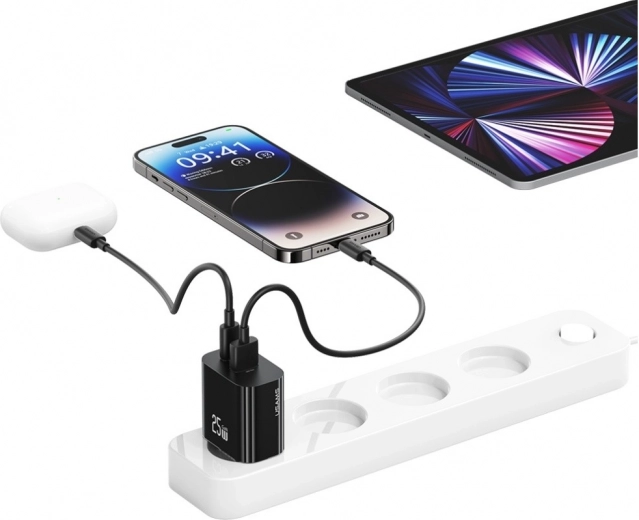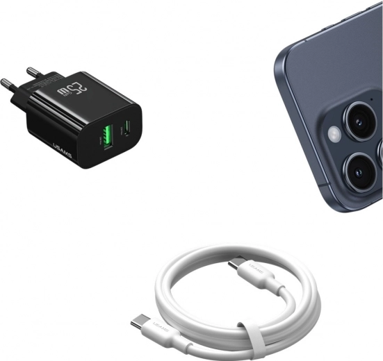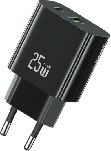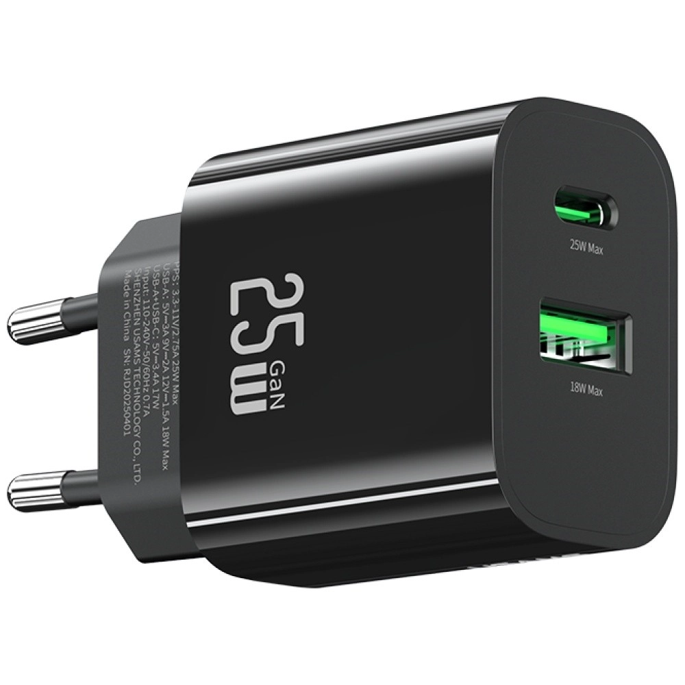 Compacte netlader van USAMS met een vermogen van 25 W, poorten USB‑C + USB‑A en Fast Charging technologie voor snel en veilig opladen. Dankzij de intelligente chip, stabiele spanning en bescherming tegen overbelasting is hij ideaal voor smartphones, tablets en oordopjes. Licht en duurzaam ontwerp in een elegante zwarte kleur, perfect voor op reis.