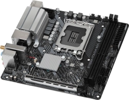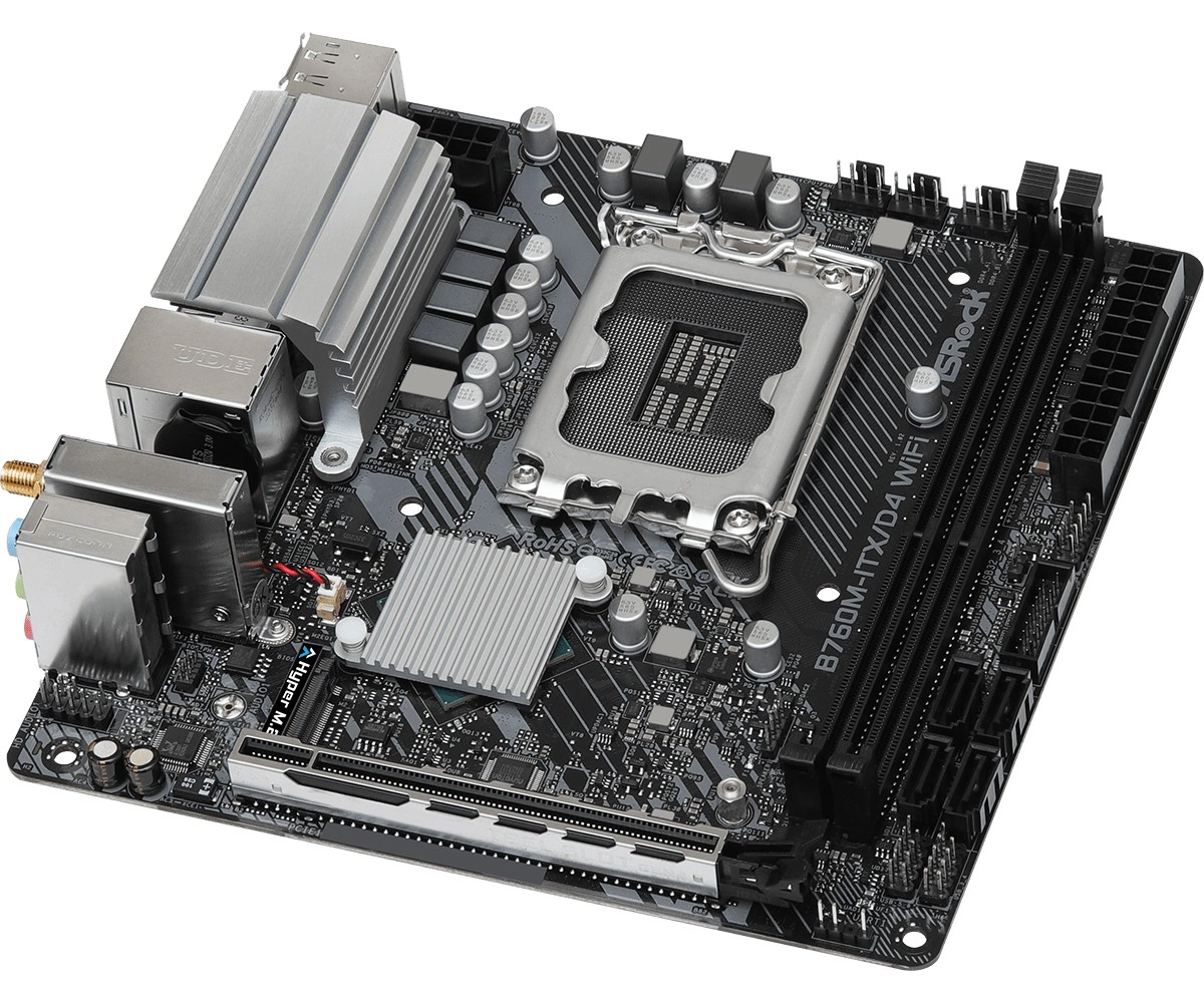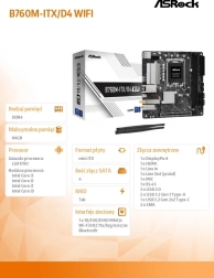 Het compacte moederbord ASRock B760M-ITX/D4 WiFi voor socket LGA1700 ondersteunt Intel Core processors van de 12e/13e/14e generatie en biedt PCIe 4.0, M.2 NVMe Gen4 x4, Wi‑Fi 6E met Bluetooth, uitgebreide USB 3.2 Gen2x2 Type‑C-connectiviteit en verbeterde Nahimic-audio. Dankzij het 5+1+1-fase VRM met Dr.MOS, een 6‑laags PCB en een verstevigde stalen PCIe‑sleuf levert het stabiliteit, prestaties en betrouwbaarheid in het kleine mini‑ITX‑formaat.