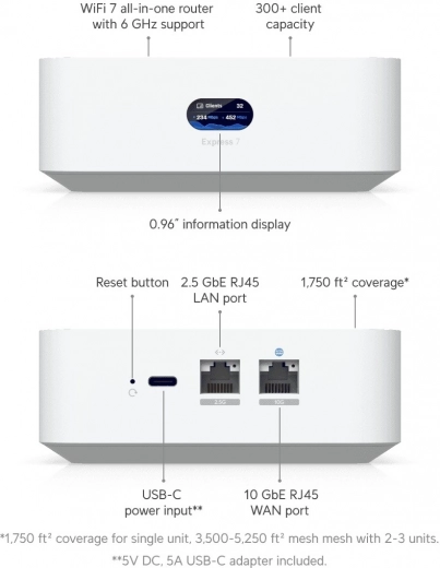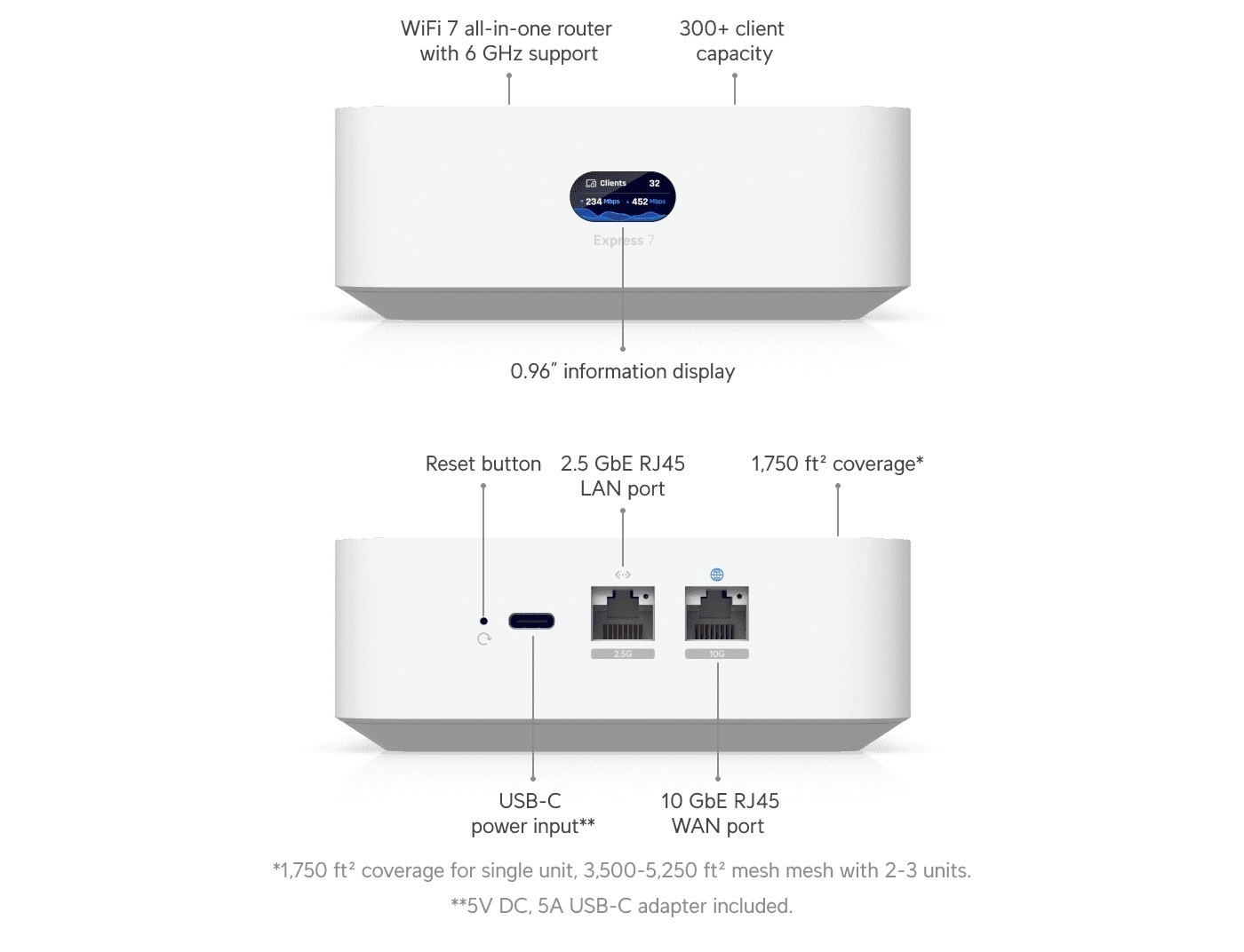 - Alles‑in‑één: gateway, controller en AP met Wi‑Fi 7