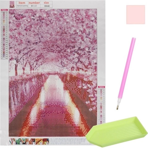 Ontdek de ontspannende wereld van diamantschilderen en maak je eigen kunstwerk met het romantische motief van een kersenbloesemlaan. De set bevat alles wat je nodig hebt en is ideaal voor zowel beginners als gevorderden. Dankzij het gecodeerde canvas werk je eenvoudig en precies, en het voltooide schilderij schittert met een subtiele, sprankelende glans. Een geweldige manier om te ontspannen, creativiteit te ontwikkelen en een originele interieurdecoratie te verkrijgen.