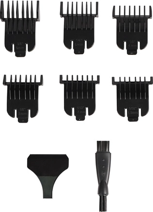 In de verpakking vind je 6 geleidekammen (1–9 mm), een USB‑C‑kabel, een bladbescherming en een reinigingsborsteltje voor eenvoudig onderhoud. Je kunt de trimmer draadloos én tijdens het opladen gebruiken, dus altijd klaar voor thuis en in de barbershop.