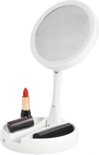 Elegante tafelspiegel met LED-verlichting en dubbelzijdig oppervlak (1× en 10× vergroting) is ideaal voor make-up, huidverzorging en het inzetten van lenzen. Dankzij de 180° draaibare constructie schakel je eenvoudig van zijde, terwijl de praktische organizer in de voet je cosmetica binnen handbereik houdt. Voeding via 4× AA-batterijen of MicroUSB-kabel voor maximaal gemak.