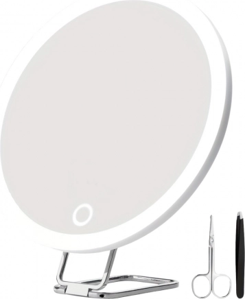 Praktische cosmeticaspiegel met 30× vergroting en LED-achtergrondverlichting biedt 3 lichtmodi (koud, warm, natuurlijk) en traploze helderheidsregeling. Dankzij de geheugenfunctie, sterke zuignap en verstelbare houder plaats je hem gemakkelijk op een glad oppervlak of gebruik je hem als tafel- of handspiegel. De ingebouwde 1500 mAh accu gaat tot 7 dagen mee op één lading en in de verpakking vind je ook een stalen pincet en schaar voor perfecte detailverzorging.
