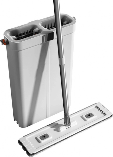 De moderne tweekamer-emmer scheidt schoon en vuil water voor een hygiënischere en snellere schoonmaak. De vlakmop met verstelbare telescoopsteel past zich eenvoudig aan de lengte van de gebruiker aan en bereikt smalle plaatsen, onder bedden of kasten.