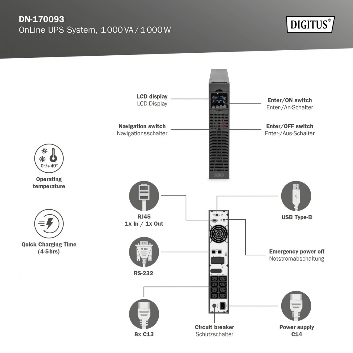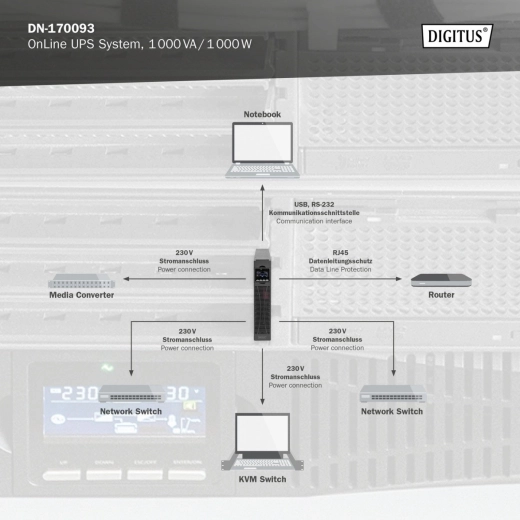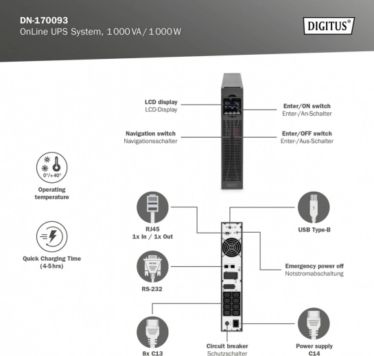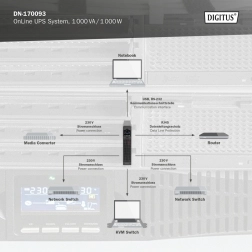 De professionele Online UPS van DIGITUS is ontworpen voor continue bescherming van servers, netwerkcomponenten en werkstations. Dubbele conversie met microprocessorbesturing levert een zuivere sinus en stabiele spanning zonder omschakeling, zodat data en hardware beschermd zijn bij uitval, onder‑ of overspanning. Dankzij de hoge power factor en krachtige lader is hij geschikt voor veeleisende bedrijfsomgevingen.
