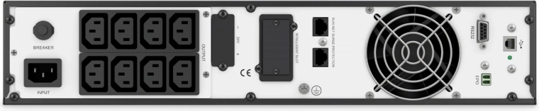 Het draaibare LCD‑display toont laadstatus, batterijstatus, AC‑modus, batterijmodus, bypass en foutmeldingen. De Rack/Tower constructie maakt flexibele installatie in een 19" rack of standalone mogelijk. Intelligente regeling van laden en ventilatorsnelheid verlengt de levensduur van de accu’s en verhoogt de betrouwbaarheid.