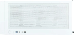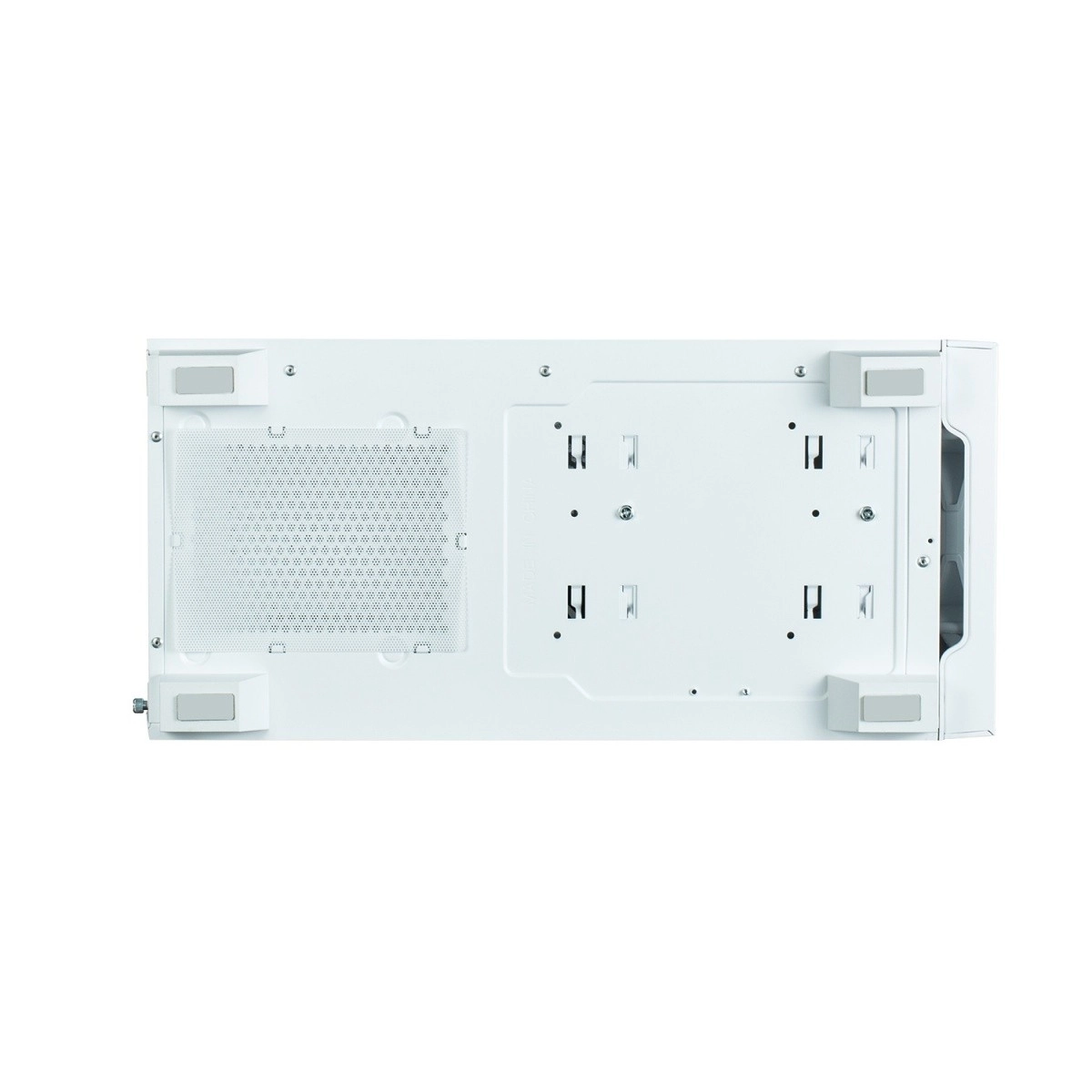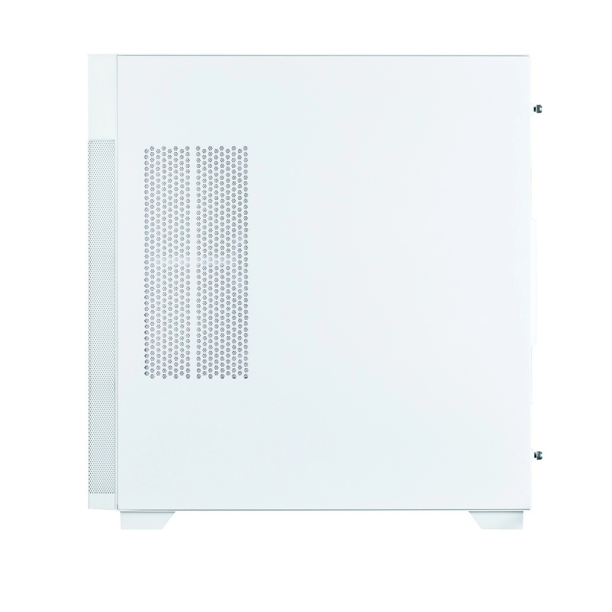 De minimalistische witte uitvoering met een zijpaneel van gehard glas en doordachte zijventilatie ondersteunt stille en efficiënte werking.