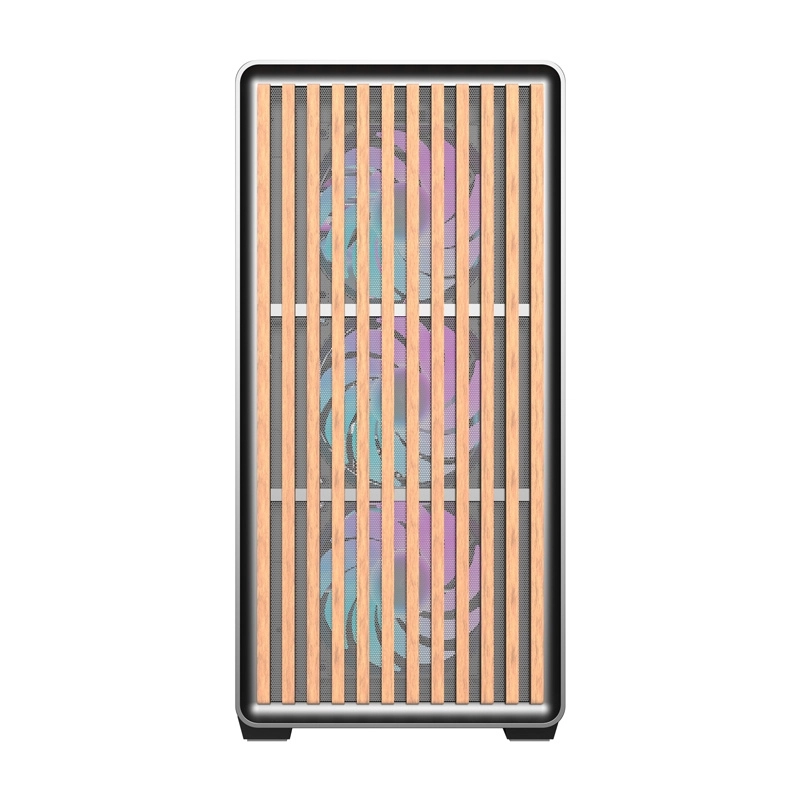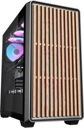 De moderne Darkflash DS900WD-behuizing valt op door het panoramische ontwerp zonder A-stijl, het houten front en het zijpaneel van gehard glas. Biedt uitstekende airflow, ondersteuning voor tot 10 ventilatoren en 360 mm radiatoren. In de verpakking zitten 4 ARGB-ventilatoren. De behuizing is stevig, eenvoudig uit te breiden en compatibel met ATX / M-ATX / ITX-moederborden.