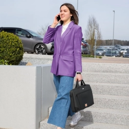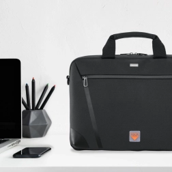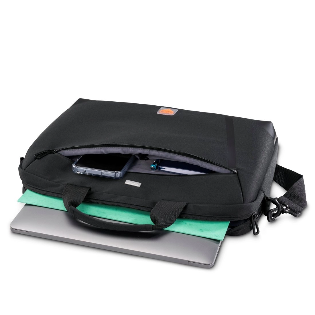 Het praktische voorvak met organizer houdt kabels, oplader, telefoon en documenten overzichtelijk op hun plek. Binnenin vind je een elastische fixatieband met klittenband die de laptop veilig vastzet. Voor draagcomfort is er een afneembare en verstelbare schouderriem en een riem om over het handvat van een koffer te schuiven. De elegante look wordt onderstreept door details van gerecycled (eco) leer.