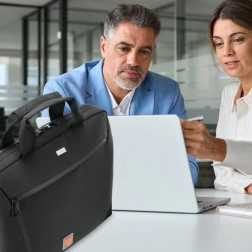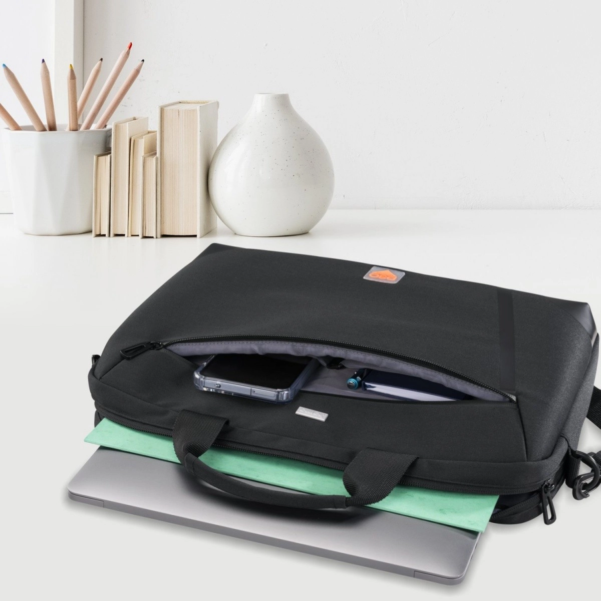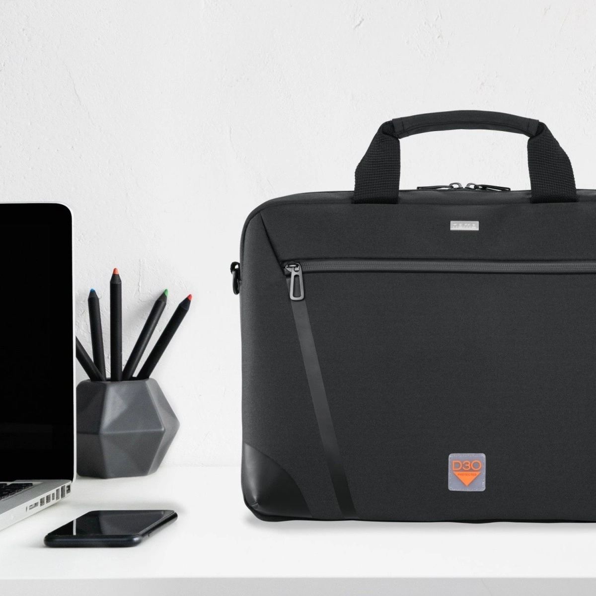 Elegante en duurzame laptoptas met geavanceerde D3O-bescherming voor apparaten tot 16,2". Biedt een water- en vuilafstotend oppervlak, een praktische organizer voor accessoires, een afneembare schouderriem en de mogelijkheid tot bevestiging op een koffer voor comfortabel reizen.