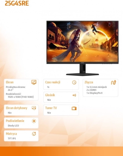 Stap de wereld van snelheid en precisie binnen met de AOC 25G4SRE. De 24,5" diagonaal en Full HD-resolutie (1920 × 1080) leveren een scherp beeld, terwijl het Fast IPS-paneel zorgt voor geweldige kleuren en brede kijkhoeken van 178°/178°. De verversingssnelheid van 300 Hz met mogelijkheid tot overklokken tot 310 Hz en een responstijd van 0,3 ms (MPRT) minimaliseren motion blur en input lag – ideaal voor e-sports en snelle actietitels.