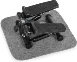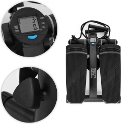 Het geïntegreerde LCD‑display (5 functies) toont duidelijk de tijd, stappen/min, totaal aantal stappen, verbrande calorieën en de SCAN-modus. Antislippedalen en stabilisatiepootjes zorgen voor veiligheid en comfort. De beschermende onderlegger van wolvilt dempt trillingen, beschermt de vloer en voorkomt verschuiven van het apparaat, zelfs in kleinere ruimtes.