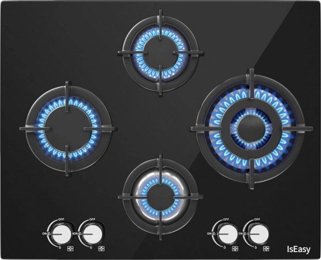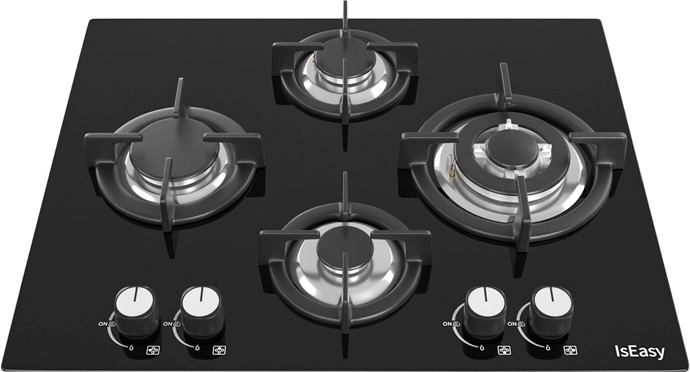 De Iseasy-kookplaat blinkt uit door de combinatie van stijl en prestatie. Vier branders met vermogens van 3,3 kW, 2,7 kW, 1,75 kW en 1 kW dekken alles af van zacht sudderen tot snel bakken. Het duurzame geharde glas en de gietijzeren roosters garanderen een lange levensduur en eenvoudig onderhoud, terwijl pulsontsteking het dagelijks gebruik vergemakkelijkt.