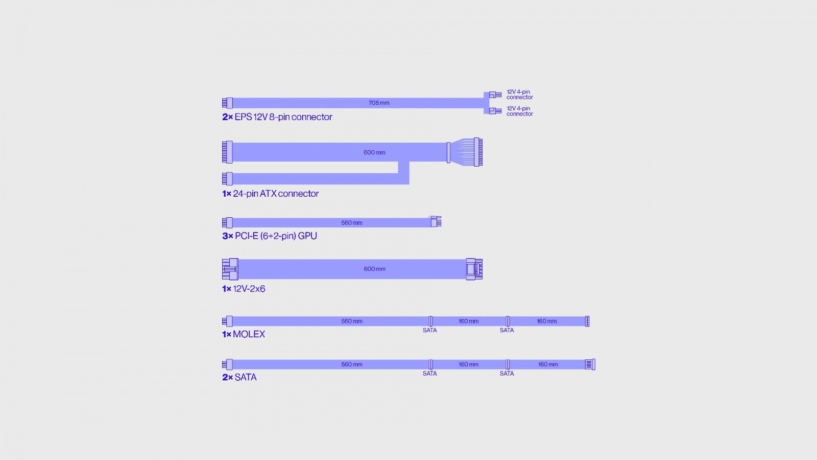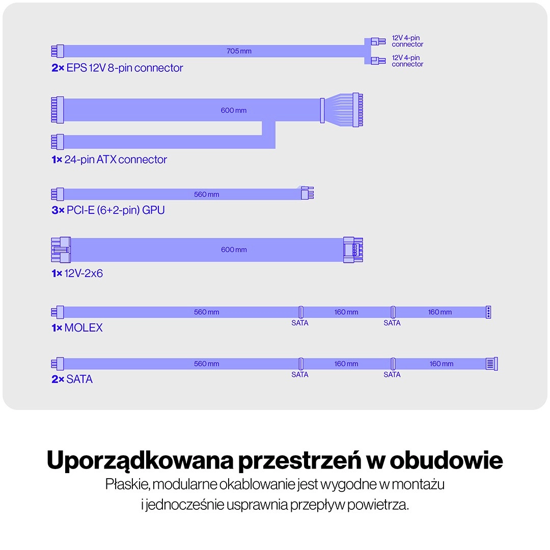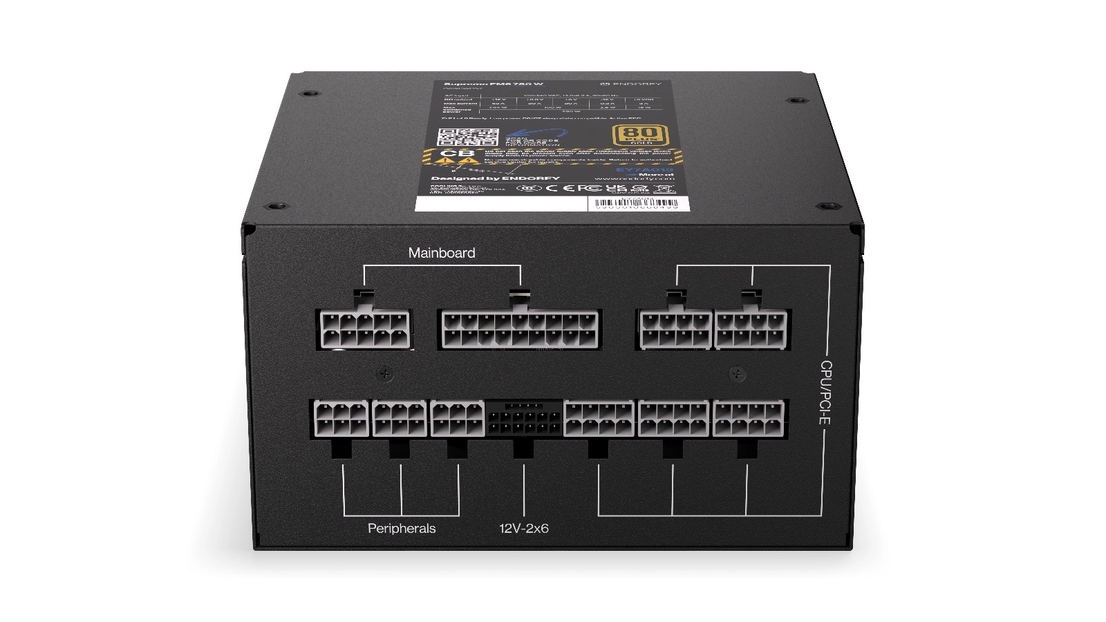 De Supremo FM6 750 W voldoet aan de nieuwste ATX 3.1-standaard en kan ook kortstondige vermogenspieken aan. In de doos vind je een 12V-2x6-kabel voor volledige compatibiliteit met moderne PCIe 5.1-GPU’s; klassieke PCI-E 6+2 PIN voor traditionele grafische kaarten is eveneens aanwezig.