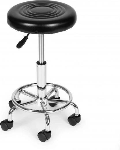Praktische draaikruk met rugleuning van ModernHome voor beautysalons, kappers en praktijken. Biedt traploze hoogteverstelling met een pneumatische lift, 360° draaibare zitting, een stabiele vijfpotige basis met wieltjes en bekleding van duurzaam PVC-leer. Het comfort wordt verzekerd door 5 cm dik schuim en een stille, soepele beweging zonder krassen op de vloer.