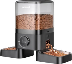 Maak het voeren van twee katten eenvoudiger met de ONEISALL PF09 voerautomaat. Hij biedt een reservoir van 5 l, programmering tot 6 maaltijden per dag, dubbele voerbakken voor rustig eten en noodvoeding op batterijen. Intuïtieve bediening met één draairegelaar, eenvoudige reiniging en een stabiele constructie zorgen voor comfort en veiligheid voor je huisdieren.