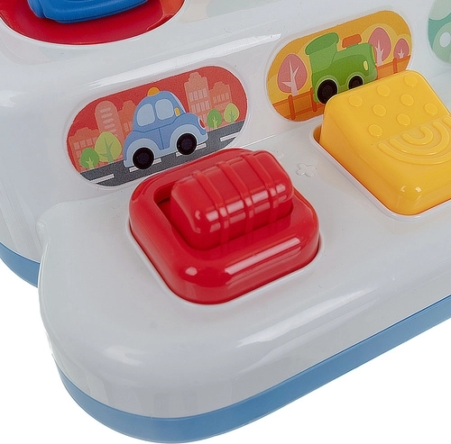Leuk educatief speelgoed voor kinderen vanaf 18 maanden dat de oog-handcoördinatie, fijne motoriek en logisch denken ondersteunt. De compacte basis verbergt vier voertuigen die bij het bedienen van verschillende knoppen en hendels tevoorschijn springen. Dankzij de verschillende knopvormen (hendel, draaiknop, drukknop) stimuleert het de zintuiglijke waarneming en leert het het principe van oorzaak–gevolg.