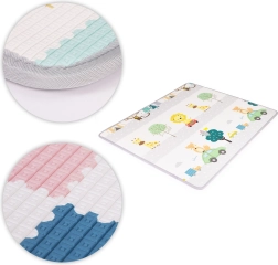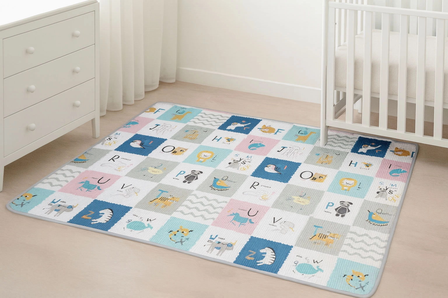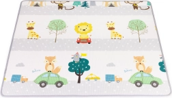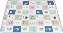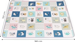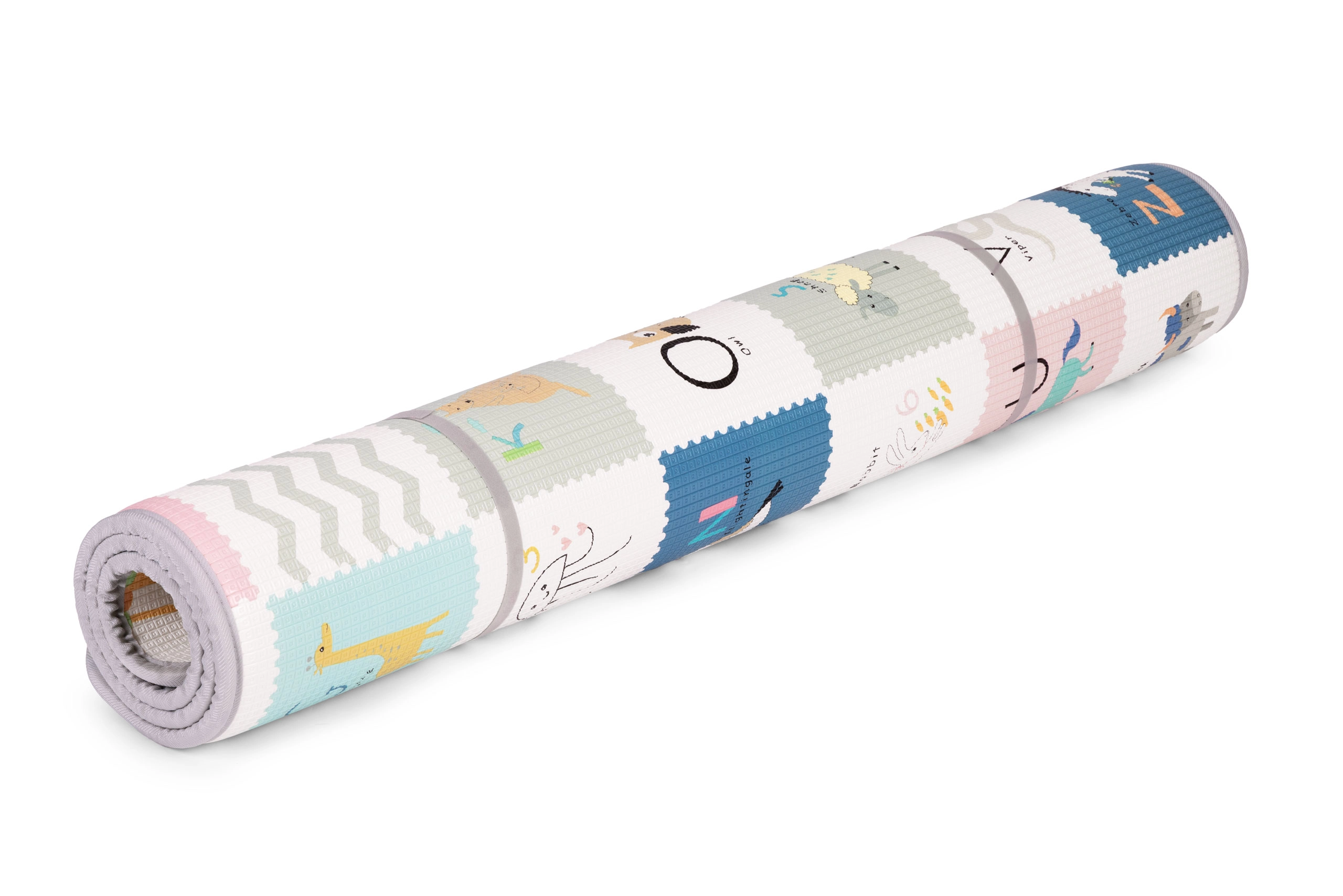De dubbelzijdige print prikkelt de fantasie en het leren: één zijde biedt een vrolijk alfabet met afbeeldingen en Engelse woordjes, de andere dieren, vervoersmiddelen en natuur. Je kunt de mat gemakkelijk oprollen en vastzetten met klittenbandriemen – ideaal voor opruimen en meenemen naar de speelkamer, grootouders of op vakantie.