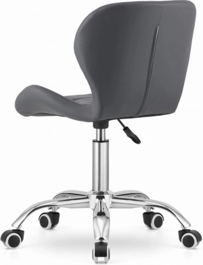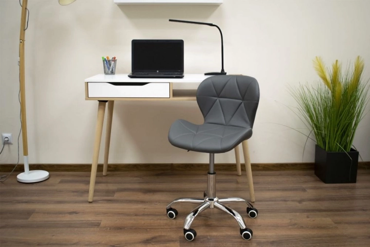 De stijlvolle draaistoel AVOLA in elegant grijs biedt een modern design, een brede ergonomische rugleuning en comfortabele bekleding van ecoleer. De stabiele verchroomde 5-ster basis met rubberen wielen zorgt voor soepel bewegen en bescherming van de vloer. Een geweldige keuze voor kantoor, kinderkamer, studio en schoonheidssalon.