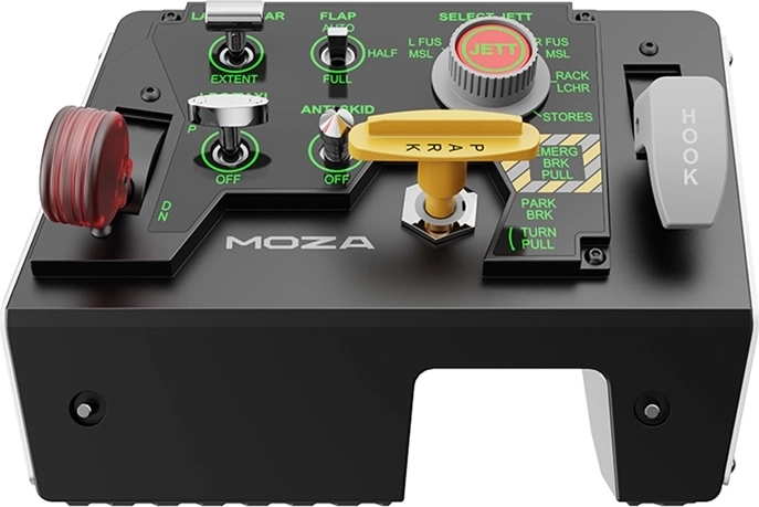 Het paneel is modulair compatibel met andere MOZA‑apparaten (bijv. MTP‑throttlepaneel) en in de MOZA Cockpit software map je eenvoudig knoppen, schakelaars en lichteffecten. Zo krijg je volledige controle over kleppen, landingsgestel, haken, bewapening en andere functies – precies volgens jouw voorkeuren.