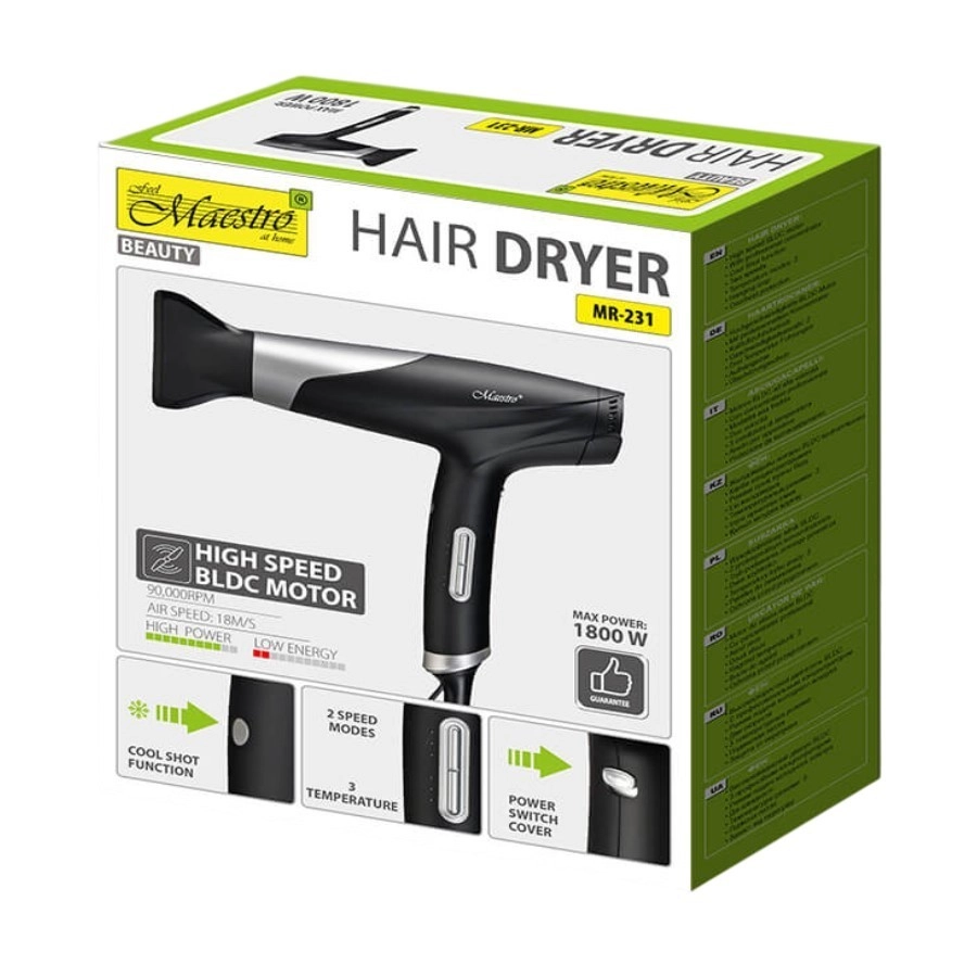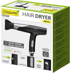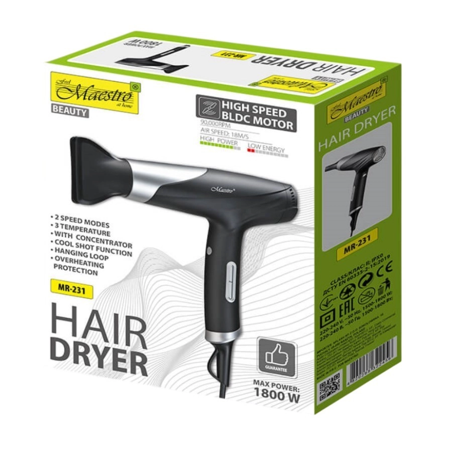 De MAESTRO MR-231 is een betrouwbare föhn, ontworpen voor efficiënte dagelijkse haarverzorging. Het krachtige vermogen van 1800 W in combinatie met de BLDC‑motor met 90.000 t/min zorgt voor snelle resultaten, zelfs bij dik en lang haar. De luchtsnelheid van 18 m/s verkort de droogtijd en helpt het haar te beschermen tegen overmatige hitte.