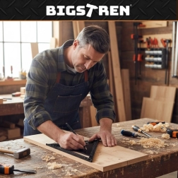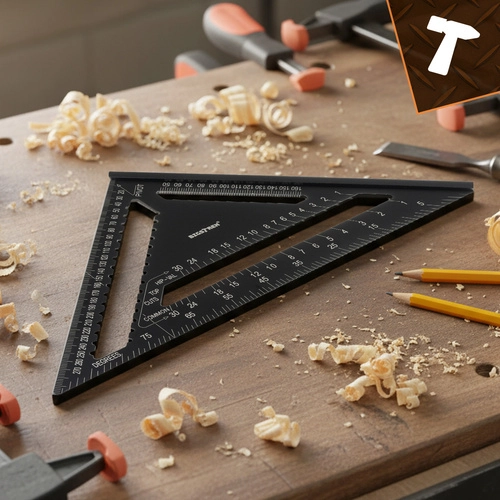 Betrouwbare timmermanshaak BIGSTREN met afmetingen 30 × 30 cm, ontworpen voor snel en precies aftekenen en meten. Dankzij de combinatie van hoeken 90° en 45°, schalen in cm en inches en een getande rand kunt u haakse en schuine zaagsneden, maatoverdracht en het uitlijnen van randen eenvoudig uitvoeren.