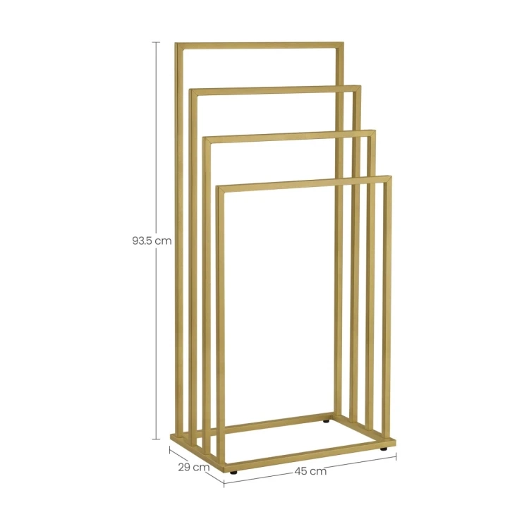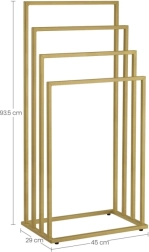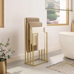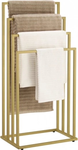 Breng orde en stijl in de badkamer. Vier trapvormig geplaatste armen zorgen voor luchtcirculatie voor sneller drogen van handdoeken, badjassen en zwemkleding. Het minimalistische frame in mat goud past in zowel moderne als klassieke interieurs en bespaart ruimte dankzij de verticale opzet.