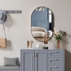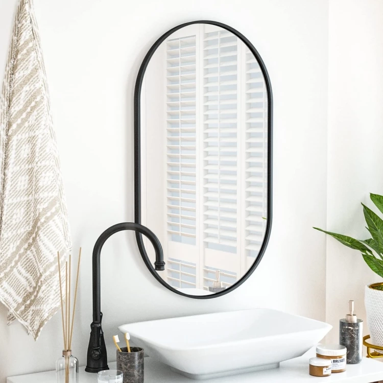 De universele ovale spiegel is een functioneel én decoratief element dat de ruimte oplicht en extra elegantie geeft. Het grote spiegelvlak is ideaal voor het checken van je outfit, make-up of het stijlvol afwerken van het interieur. De slanke zwarte aluminium lijst benadrukt de minimalistische en moderne uitstraling die eenvoudig te combineren is met diverse interieurstijlen.